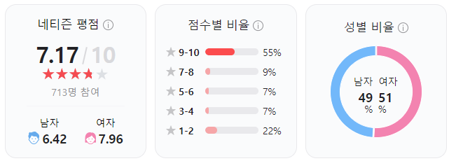✔️ 9-10점 비율이 55%, 1-2점 비율이 22%정도로 상당히 호불호가 있는 작품으로 볼 수 있습니다.